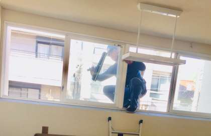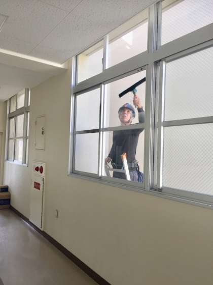 業者の方に来ていただき、普段することができない高所の窓の清掃をしていただきました。