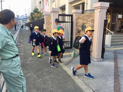 大正区役所から、吉田康人 区長さんが学校に来てくださいました。児童は登校時に元気よく区長さんとあいさつをしていました。