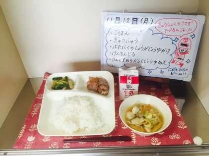 今日の給食は、ごはん、牛乳、豚肉のしょうがじょうゆかけ、けんちん汁、三度豆のからしじょうゆあえです。