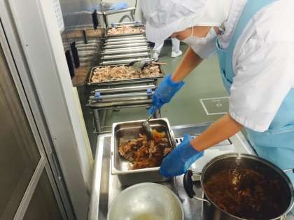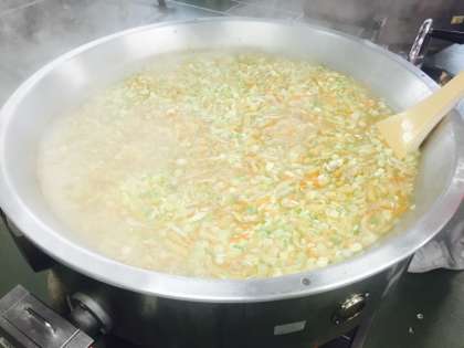 今日の給食に登場する「けんちん汁」は、にんじん、れんこん、だいこん、とうふ、うすあげをいためてコクを出して作りました。