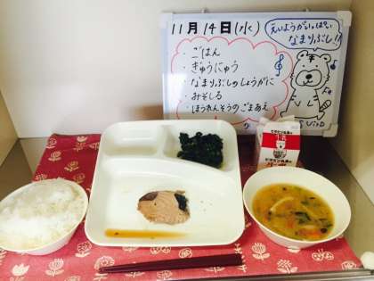 今日の給食は、ごはん、牛乳、なまりぶしのしょうが煮、みそ汁、ほうれん草のごま和えです。