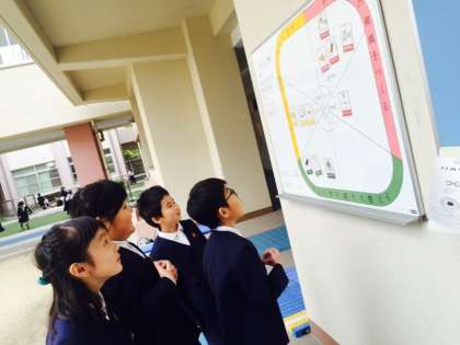 写真は、今日の給食と休み時間に子どもたちが明日の給食の献立を確認しにきている様子です。