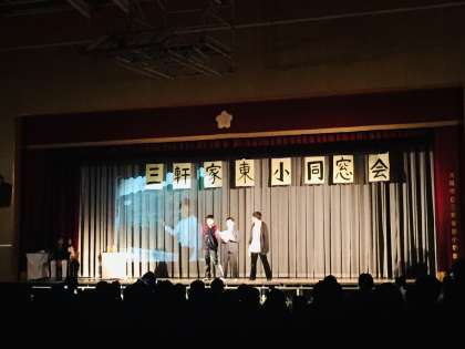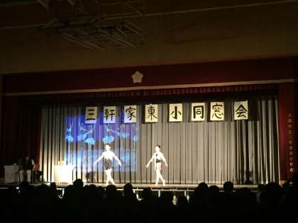6年「12年後の同窓会」の発表です。ダンサーになる夢や学校の先生になる夢をかなえています。スクリーンには、授業をしている雰囲気を写しています。「中学校で社会を教えています。歴史のことならなんでも聞いてください。」「公民が得意です。」「僕は小学校の先生です。クラスのみんなが楽しく自分らしく過ごせるクラスの担任です。」
