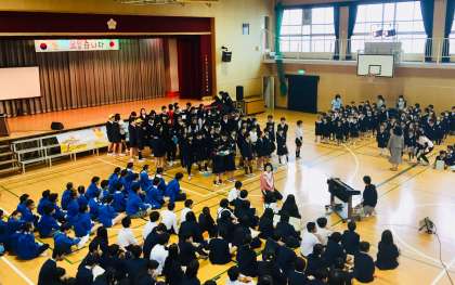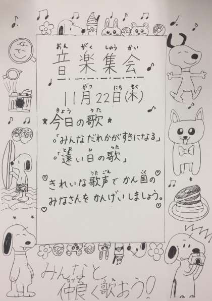 今日は、全校音楽集会をしました。今日は、韓国から来日されている小学生が来られています。きれいな歌声で、韓国から来られた小学生をかんげいしました。