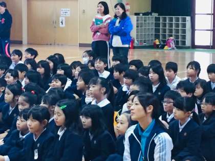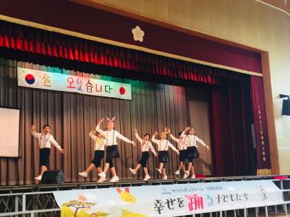 韓国の小学生との交流の様子です。全校児童で『안녕하세요 アンニョンハセヨ』とあいさつをした後、韓国の小学生のダンスチーム「サファリ」の方がダンスを披露してくれました。