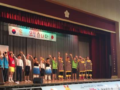 韓国の小学生との交流の様子です。韓国の小学2年生から6年生のダンスチーム「サファリ」は、2017年アンドン世界仮面げき大会で大賞を受賞されています。