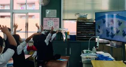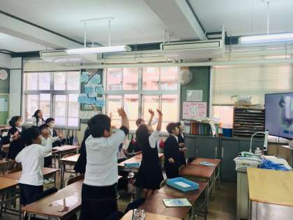 1年生のEnglish Timeの様子です。子どもたちは、リズムに乗って、体で大きく表現しながら、英語を発音しています。