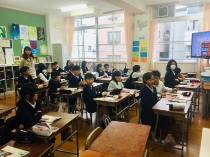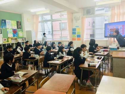4年生の英語活動の様子です。中学校から英語の先生が研修のために参観されました。