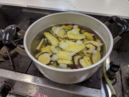 1、さつまいもを適当な大きさに切り、鍋に入れます。お水をいれて火にかけます。