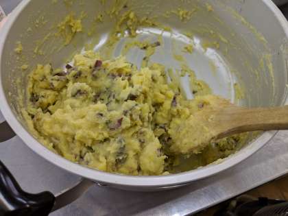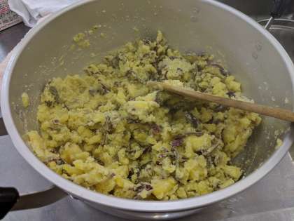 3、さつまいもがつぶれたら、マーガリン、牛乳、さとうを入れてできあがり★今回は、ラップにくるんで丸くしました。