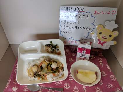 今日の給食は、中華丼、牛乳、もやしの中華あえ、りんごです。