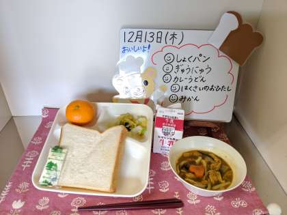 今日の給食は、食パン、牛乳、カレーうどん、白菜のおひたし、みかん、マーガリンです。