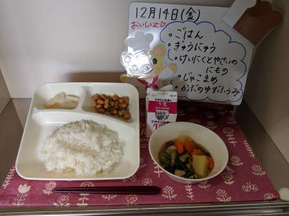 今日の給食は、ごはん、牛乳、鶏肉と野菜の煮物、じゃこ豆、かぶのゆず風味です。