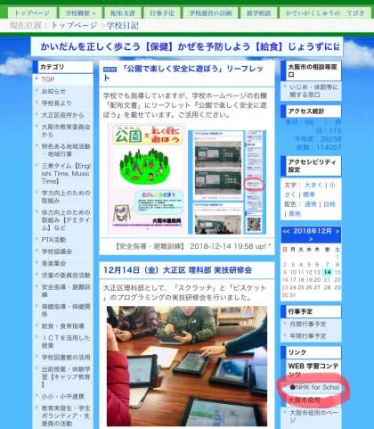 学校ホームページ 右欄「WEB 学習コンテンツ」に「NHK for School」のリンクを貼っています。プログラミング学習など、ネットを通じて色々な学習ができます。ご活用ください。他にも、お子さまが活用できる「学習のページ」には●をつけています。