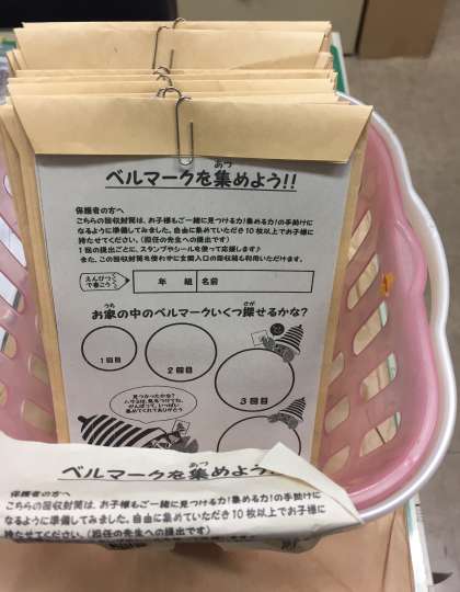 ご家庭で、ベルマーク収集をしてくださり、ありがとうございました。明日、お子さまに収集袋を返却いたします。スタンプ用紙が2枚めの方は、記名をお願いします。