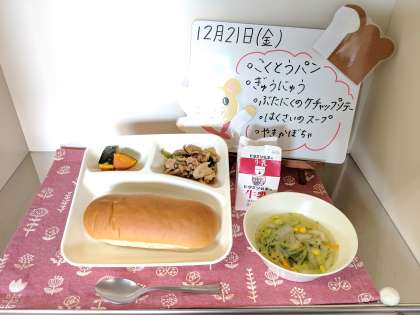 今日の給食は、黒糖パン、牛乳、豚肉のケチャップソテー、はくさいのスープ、焼きかぼちゃです。