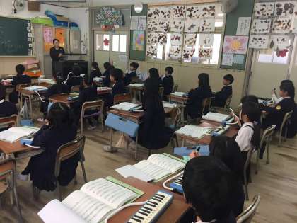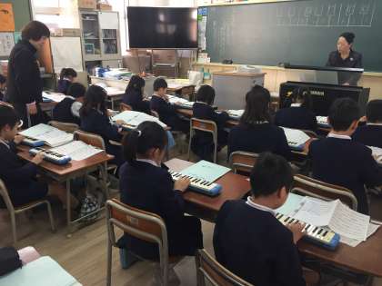 鍵盤ハーモニカの練習をしています。校長先生に教えていただいています。