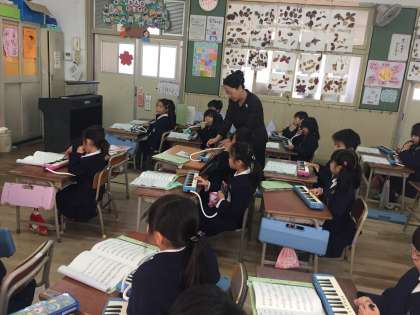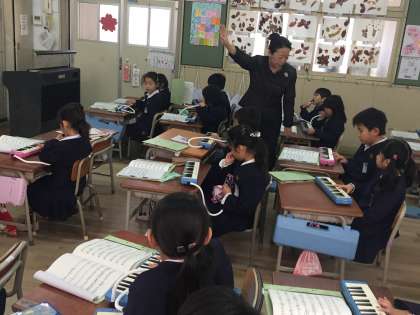 鍵盤ハーモニカの練習をしました。校長先生に指づかいなどを教えていただきました。