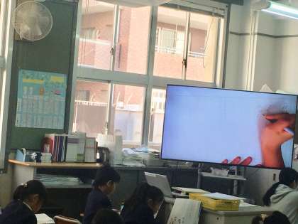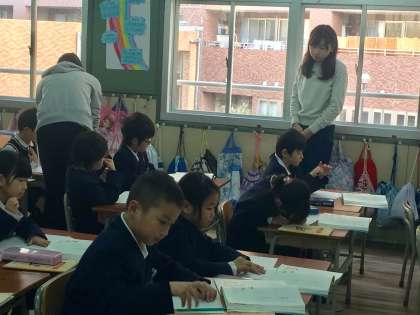 国語の学習で視写をしています。「大型テレビ」と「書画カメラ」を活用して、視写の仕方を指導しています。視写をすることで、文章を書く力を高めることをめざしています。