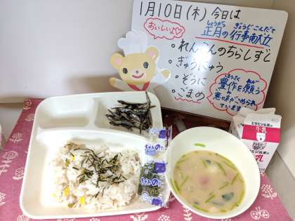 今日の給食は、れんこんのちらしずし、牛乳、雑煮、ごまめです。