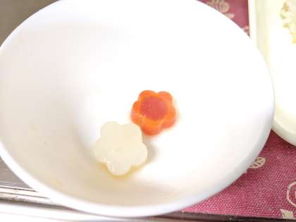 うめ型のラッキーにんじんとラッキーだいこんを調理員さんが作ってくださいました。それぞれ50個、雑煮に入っています。