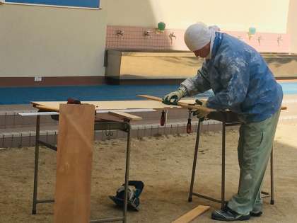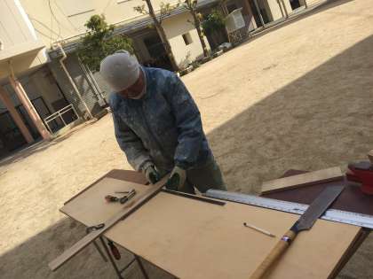 学校図書館には、これからもたくさんの本が入ってきます。管理作業員さんが、本棚の板を作ってくださっています。
