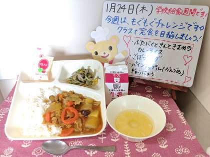 今日の給食は、豚肉と金時豆のカレーライス、牛乳、ごぼうサラダ、パインアップル(缶)です。