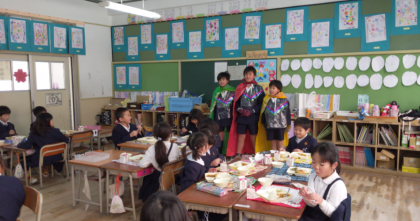 給食の時間、1年生の教室に野菜戦隊!給食レンジャーが遊びに来てくれました!