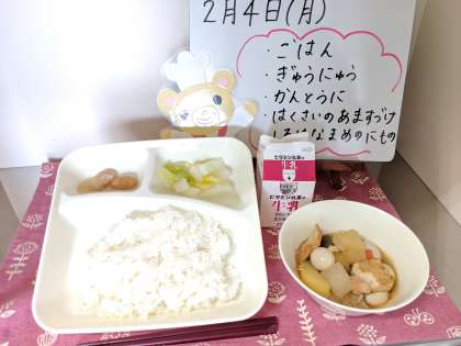 今日の給食は、ごはん、牛乳、関東煮、はくさいの甘酢づけ、白花豆の煮ものです。