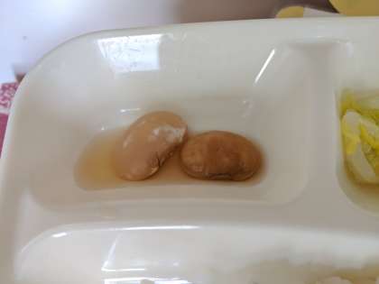 白花豆の煮ものは、食物せんいが多く含まれているので、児童に食べてほしい食品の一つです。砂糖と塩、しょうゆで甘辛く煮ました。