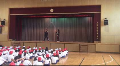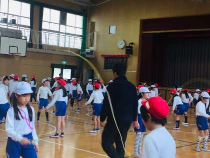 吉備国際大学の近江望先生に、なわとびの出前授業をしていただきました。二人組で跳んでいます。