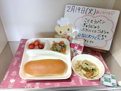 今日の給食は、黒糖パン、牛乳、豚肉とごぼうの煮物、なにわうどん、プチトマトです。
