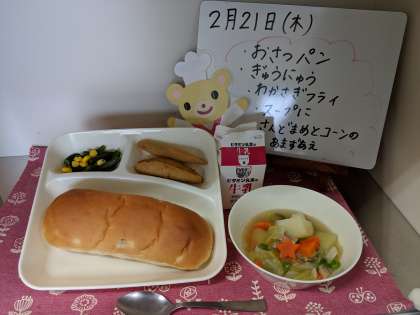 今日の給食は、おさつパン、牛乳、わかさぎフライ、スープ煮、三度豆とコーンの甘酢あえです。