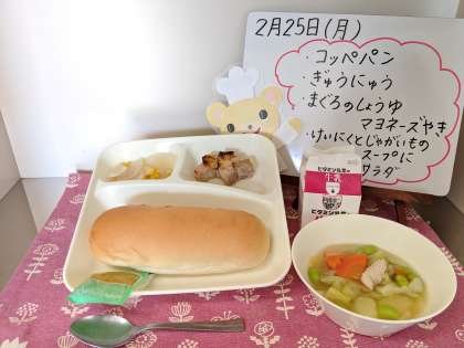 今日の給食は、コッペパン、牛乳、まぐろのしょうゆマヨネーズ焼き、鶏肉とじゃがいものスープ煮、だいこんのサラダです。
