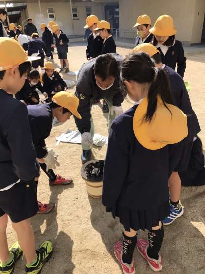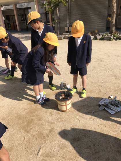 今日は、3年生が、昔体験で、七輪で火を起こしておもちを焼く体験学習をしました。