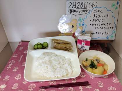 今日の給食は、ごはん、牛乳、きびなごの天ぷら、一口がんもとだいこんの煮物、あっさりきゅうりです。