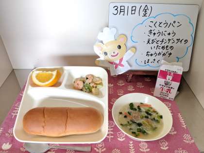 今日の給食は、黒糖パン、牛乳、えびとチンゲンサイの炒め物、中華がゆ、はっさくです。