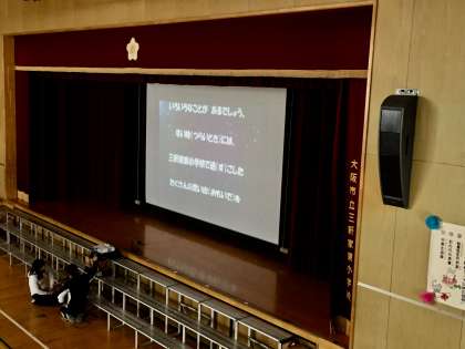 卒業おめでとう集会をしました。「思い出ムービー」を見ています。