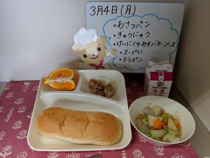 今日の給食は、おさつパン、牛乳、鶏肉のみそバターソース、スープ煮、デコポンです。