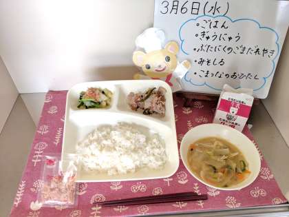 今日の給食は、ごはん、牛乳、豚肉のごまだれ焼き、みそ汁、こまつなのおひたしです。