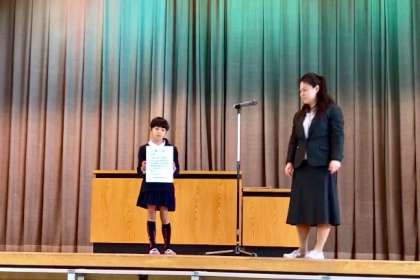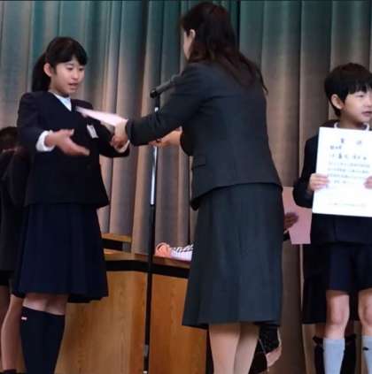 全大阪幼少年美術展で受賞された児童の表彰式をしました。最後に、特選を受賞した児童の表彰をしました。