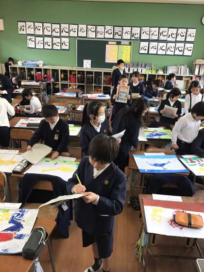 完成した紙版画をクラスのみんなで鑑賞している様子です。