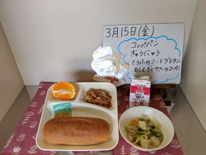 今日の給食は、コッペパン、牛乳、とうふのミートグラタン、押し麦と野菜のスープ煮、デコポンです。