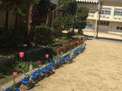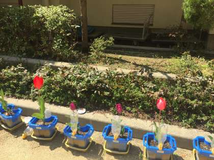 昨年度の1年生が育てたチューリップです。花が咲いています。