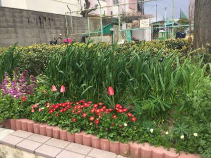 学校に隣接(りんせつ)している三軒家公園です。地域の方々が花を栽培(さいばい)してくださっています。