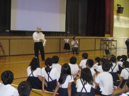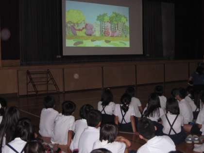 低学年児童2名が代表で、実際に、声掛け事案体験をし、学んだことを活かした行動がとれました。最後に映像でまとめをしてくださいました。みんな一生懸命聞いていました。ご家庭でも、お子様から今日の話を聞いていただければと思います。
