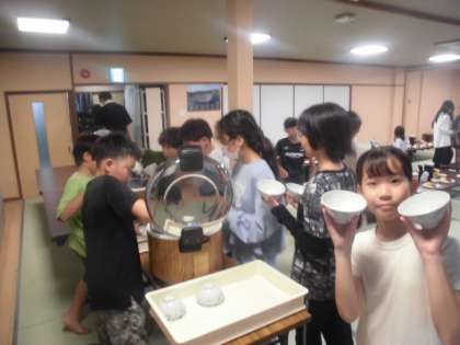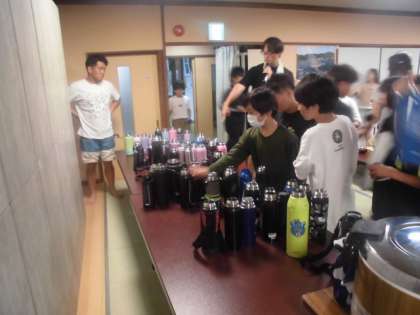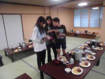 夕食の準備を食事係がしました。早く来てしっかりと準備をしてくれました。食事の前に水筒を持ってきて、宿舎の方にお茶を入れてもらいました。