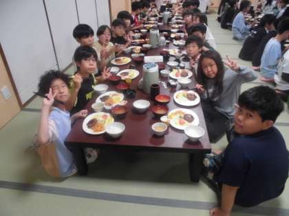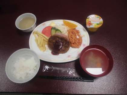 夕食はハンバーグ定食です。みんなおいしそうに食べていました。