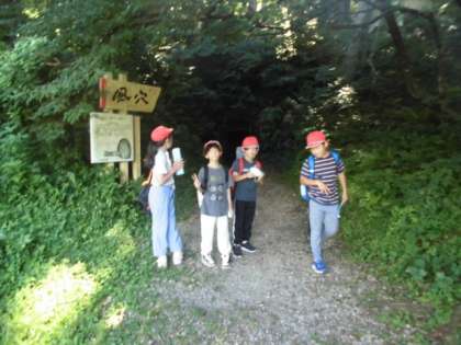 山登りに向けてスタートしました。まずはスタートの風穴に着きました。とても涼しく、その前でグループごとに写真撮影をしてオリエンテーリングスタートです。