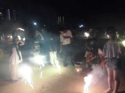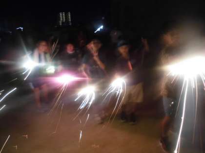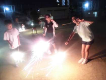カレーを食べた後は、キャンプファイヤーをしました。ばくだんゲームやもうじゅう狩りをした後、みんなでチェッコリーを踊り、とても盛り上がりました。最後に花火をしました。